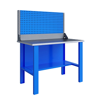 Опорные элементы выполнены сварными из холоднокатаной стали. Верстак комплектуется полкой-стенкой, расположенной под столешницей для удобного размещения габаритного инструмента и оснастки. Все металлические элементы покрыты полиэфирной порошковой краской, обеспечивающей хорошую износостойкость покрытия и невосприимчивость его к моющим средствам и смазочным веществам. Цвет и текстура покрытия корпуса тумб, опор, полки-стенки, экранов и комплектов освещения RAL 5015, гладкая, полуматовая. Цвет и текстура покрытия ящиков и дверок верстака, кронштейнов экранов и косынок RAL 7037, гладкая, глянцевая. Цвет и текстура покрытия накладок ручек ящиков и дверок RAL 9006, гладкая, глянцевая. Верстак имеет декларацию соответствия ТР ТС 025/2012 «О безопасности мебельной продукции». Верстак имеет сертификат соответствия ГОСТ Р 58863-2020 «Столы производственные. Верстаки из металла. Общие технические условия». Столешница состоит из листа влагостойкой фанеры марки ФСФ толщиной 24 мм, которая покрыта лаком-антисептиком и листом оцинкованной холоднокатаной стали толщиной 1,2 мм. Глубина столешниц 696 мм. Максимальная масса груза, равномерно распределенного по столешнице - 350 кг. Экран (перфорированная панель) верстака выполнен с квадратной перфорацией 12х12 мм с шагом 38 мм для установки крючков, держателей и других аксессуаров. Экран крепится к столешнице с помощью специальных кронштейнов. Максимальная масса груза, равномерно распределенного по поверхности экрана, составляет 21 кг.