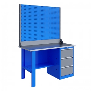 Верстак серии Technic 141.13.2-2 состоит из столешницы шириной 1396 мм, опоры, тумбы P3 с тремя большими ящикам, полки-стенки, двойного экрана с кронштейнами