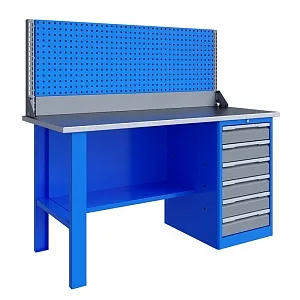 Верстак серии Technic 161.16.3-1 состоит из столешницы шириной 1596 мм, опоры, тумбы P6 с шестью малыми ящиками, полки-стенки и одинарного экрана с кронштейнами.