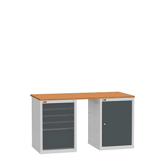 Верстак слесарный на двух тумбах. Тумба ВЛ-010 с дверцей (укомплектована 2 полками). Максимальная нагрузка на полку — 100 кг. Тумба ВЛ-015 с 5 ящиками. Максимальная нагрузка на ящик — 60 кг.