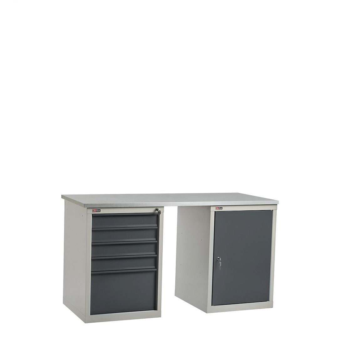 Верстак слесарный на двух тумбах. Тумба ВЛ-010 с дверцей (укомплектована 2 полками). Максимальная нагрузка на полку — 100 кг. Тумба ВЛ-015 с 5 ящиками. Максимальная нагрузка на ящик — 60 кг.