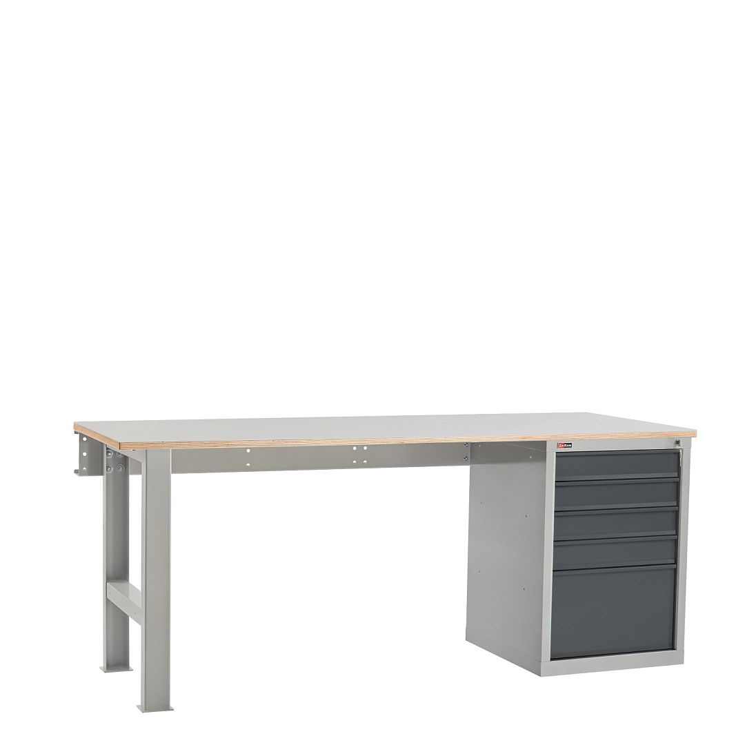 Верстак слесарный на опоре и тумбе со стяжкой. Тумба ВЛ-015 с 5 ящиками. Максимальная нагрузка на ящик — 60 кг.