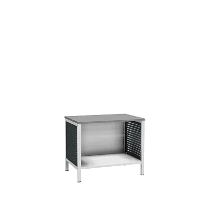 Слесарный верстак на двух опорах с нижней полкой. В опорах установлены перфорированные панели.