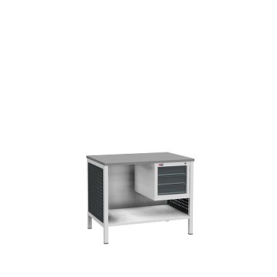 Слесарный верстак на двух опорах с нижней полкой и подвесной тумбой на 3 ящика. В опорах установлены перфорированные панели.