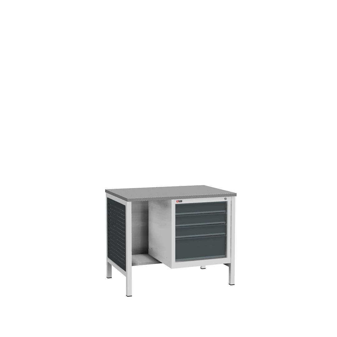 Слесарный верстак на двух опорах с нижней полкой и подвесной тумбой ВЛ-К-014 на 4 ящика. В опорах установлены перфорированные панели.