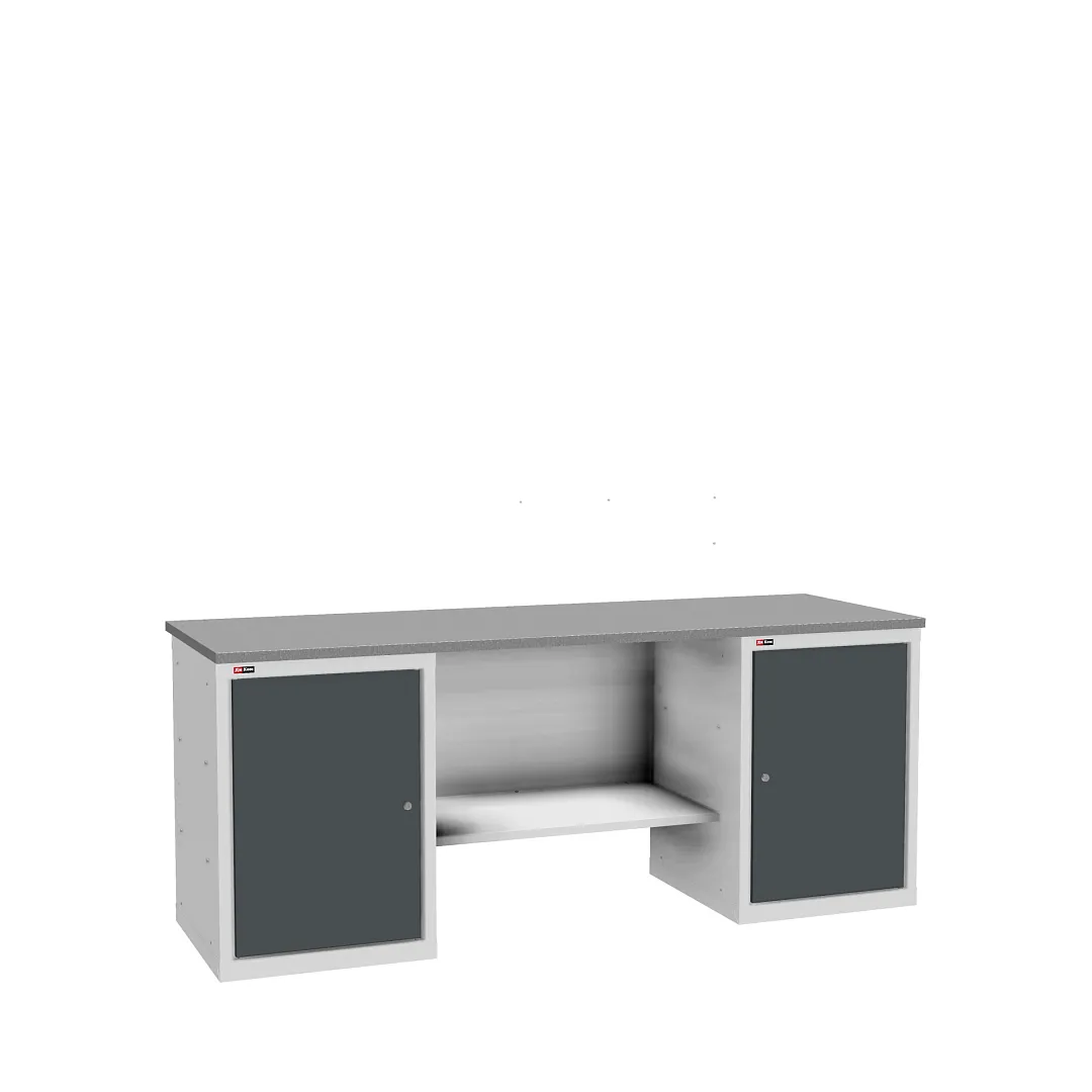 Слесарный верстак на двух тумбах с дверцей. Полка-стенка в комплекте.