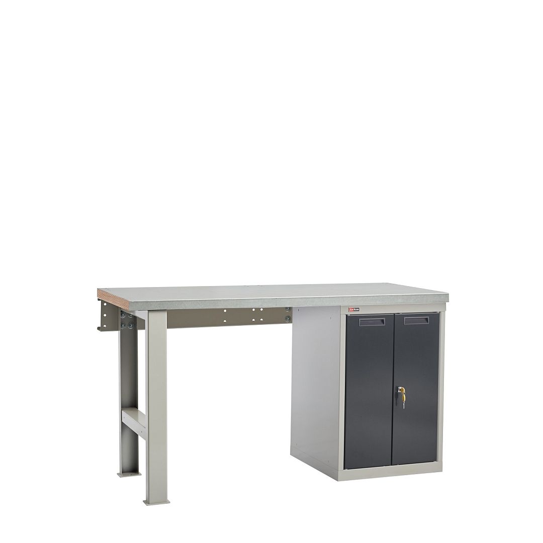 Верстак слесарный на опоре и тумбе со стяжкой. Тумба с распашными дверцами (без полок). Распределённая нагрузка на рабочую поверхность верстака - 2000 кг.