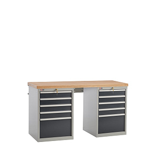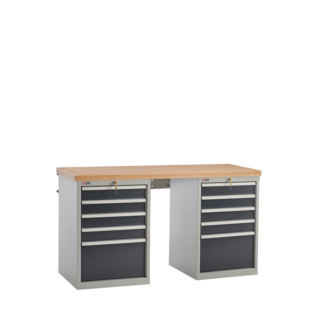 Верстак слесарный на двух тумбах со стяжкой. Тумба с ящиками. Максимальная нагрузка на ящик - 100 кг / 200 кг. Распределённая нагрузка на рабочую поверхность верстака - 3000 кг. Столешница из влагостойкой фанеры толщиной 40 мм. Корпуса тумб и ящики сварные, что обеспечивает жёсткость и устойчивость верстака.