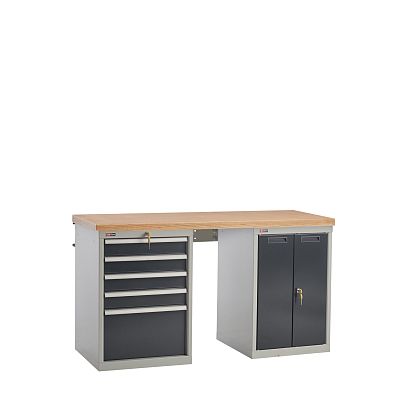 Верстак слесарный на двух тумбах со стяжкой. Тумба с ящиками. Максимальная нагрузка на ящик - 100 кг / 200 кг. Тумба с распашными дверцами (без полок). Максимальная нагрузка на полку - 200 кг. Распределённая нагрузка на рабочую поверхность верстака - 3000 кг. Столешница изготовлена из высококачественной влагостойкой фанеры толщиной 40 мм. Корпуса и ящики тумб сварные, что обеспечивает жёсткость и устойчивость верстака.