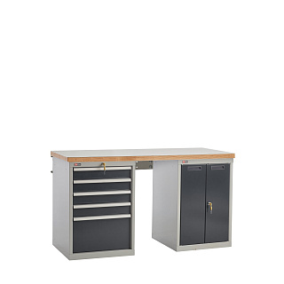 Верстак слесарный на двух тумбах со стяжкой. Тумба с ящиками. Максимальная нагрузка на ящик - 100 кг / 200 кг. Тумба с распашными дверцами (без полок). Максимальная нагрузка на полку - 200 кг.Распределённая нагрузка на рабочую поверхность верстака - 3000 кг. Столешница из влагостойкой фанеры толщиной 40 мм, покрытая оцинкованным металлическим листом толщиной 1,2 мм. Корпуса и ящики тумб сварные, что обеспечивает жёсткость и устойчивость верстака.