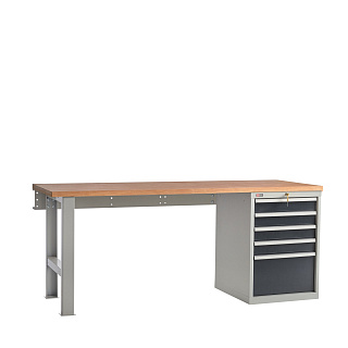 Верстак слесарный на опоре и тумбе со стяжкой. Тумба с ящиками. Распределённая нагрузка на рабочую поверхность верстака - 2000 кг. Максимальная нагрузка на ящик - 100 кг / 200 кг. Столешница из влагостойкой фанеры толщиной 40 мм.