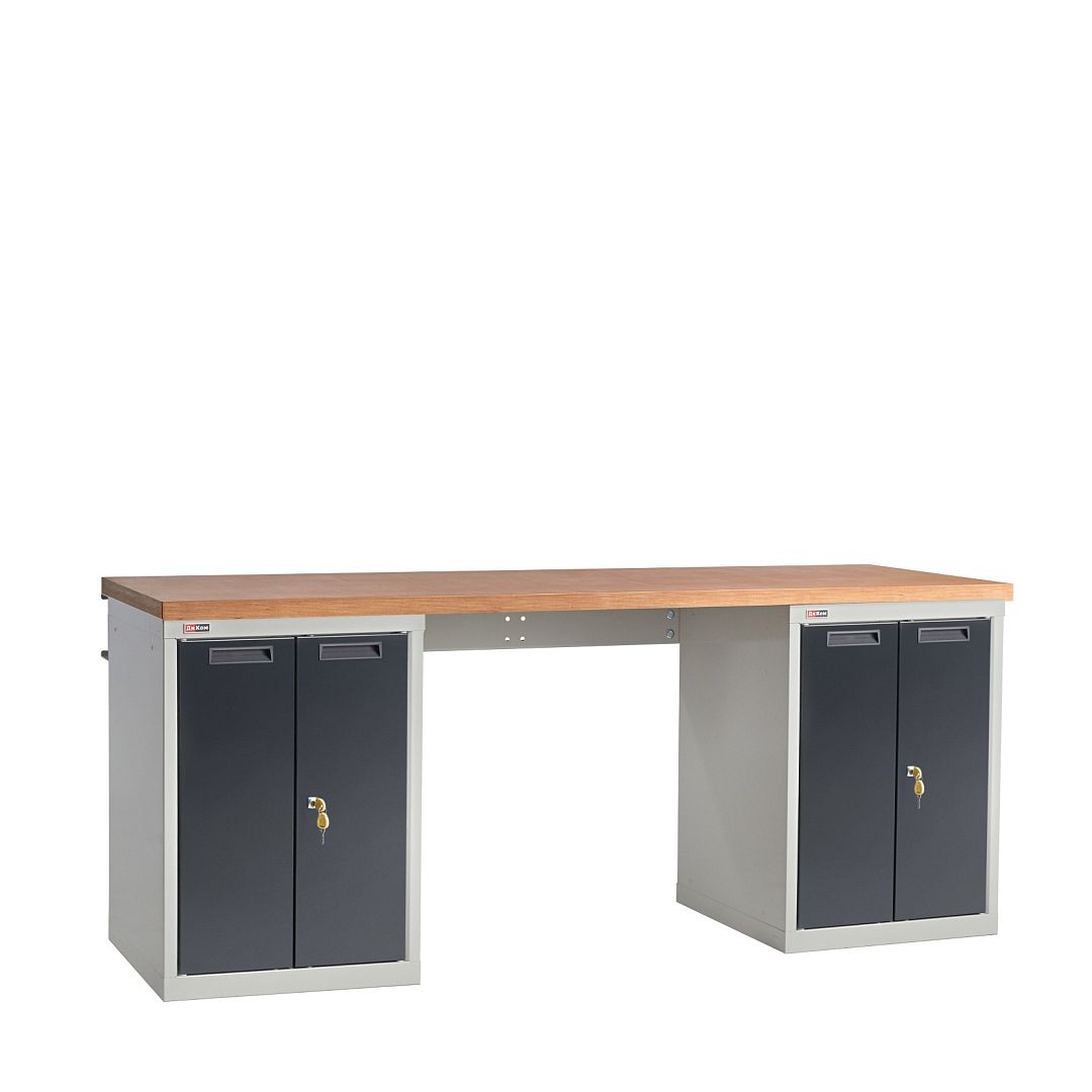 Верстак слесарный на двух тумбах со стяжкой. Тумба с распашными дверцами (без полок). Распределённая нагрузка на рабочую поверхность верстака - 3000 кг.