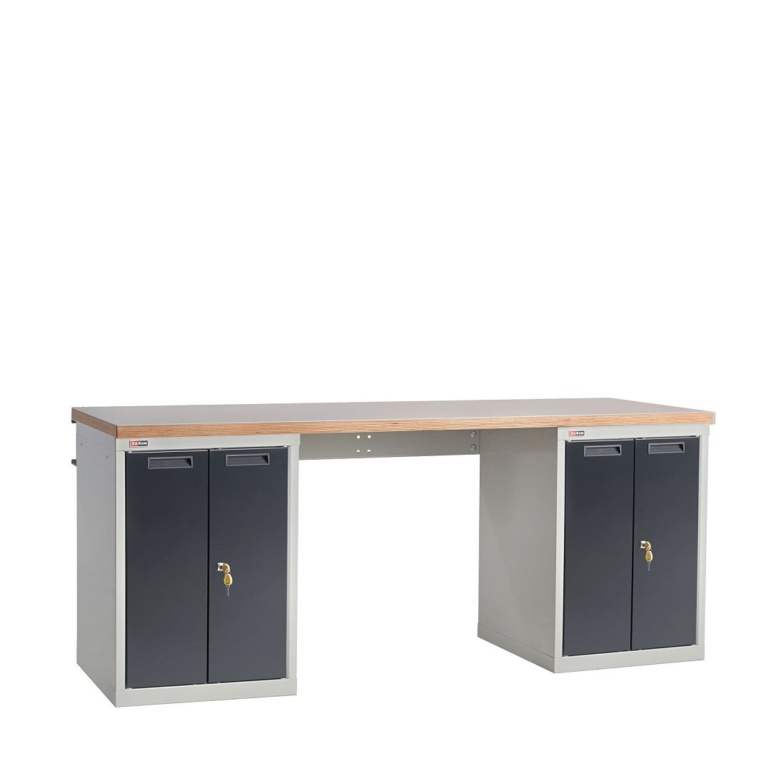 Верстак слесарный на двух тумбах со стяжкой. Тумба с распашными дверцами (без полок). Распределённая нагрузка на рабочую поверхность верстака - 3000 кг.
