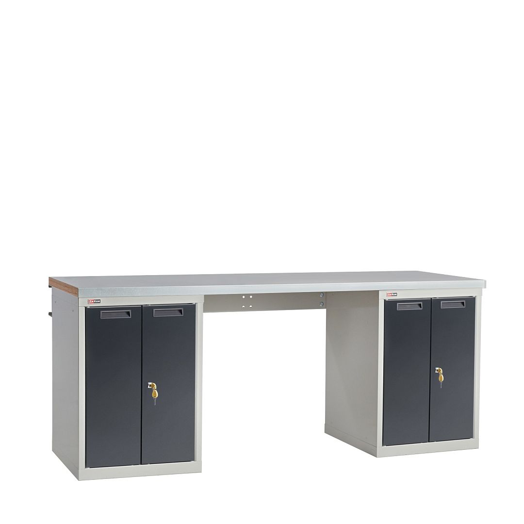Верстак слесарный на двух тумбах со стяжкой. Тумба с распашными дверцами (без полок). Распределённая нагрузка на рабочую поверхность верстака - 3000 кг.