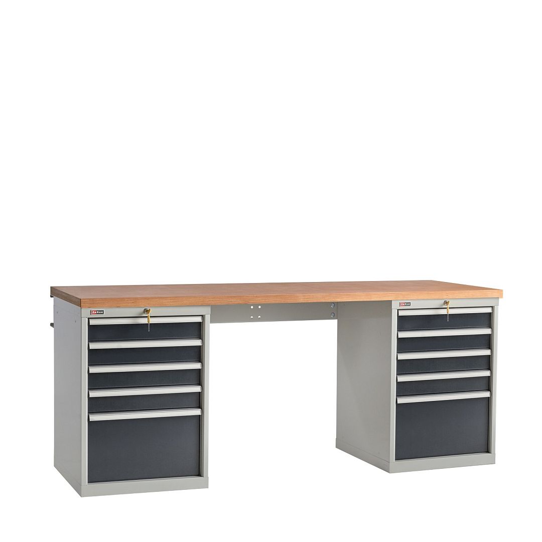 Верстак слесарный на двух тумбах со стяжкой. Тумбы с ящиками. Максимальная нагрузка на ящик - 100 кг / 200 кг. Распределённая нагрузка на рабочую поверхность верстака - 3000 кг. Столешница из влагостойкой фанеры толщиной 40 мм. Корпуса тумб и ящиков сварные, что обеспечивает жёсткость и устойчивость верстака.