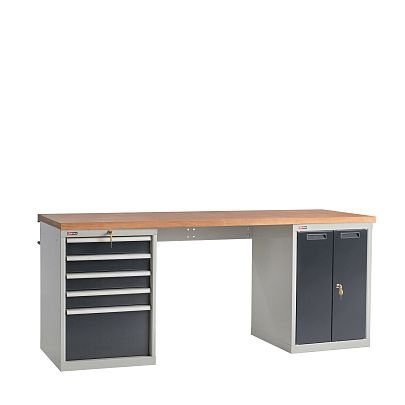 Верстак слесарный на двух тумбах со стяжкой. Тумба с ящиками. Максимальная нагрузка на ящик - 100 кг / 200 кг. Тумба с распашными дверцами (без полок). Максимальная нагрузка на полку - 200 кг. Распределённая нагрузка на рабочую поверхность верстака - 3000 кг. Столешница изготовлена из высококачественной влагостойкой фанеры толщиной 40 мм. Корпуса и ящики тумб сварные, что обеспечивает жёсткость и устойчивость верстака.