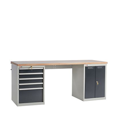 Верстак слесарный на двух тумбах со стяжкой. Тумба с ящиками. Максимальная нагрузка на ящик - 100 кг / 200 кг. Тумба с распашными дверцами (без полок). Максимальная нагрузка на полку - 200 кг. Распределённая нагрузка на рабочую поверхность верстака - 3000 кг. Столешница из влагостойкой фанеры толщиной 40 мм, покрытая металлическим листом толщиной 3 мм. Корпуса и ящики тумб сварные, что обеспечивает жёсткость и устойчивость верстака.