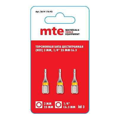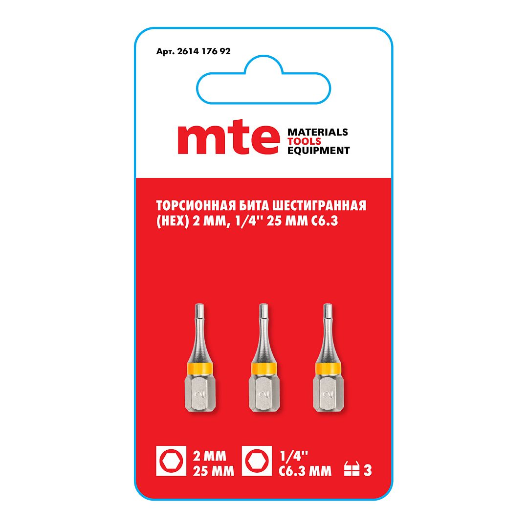 Бита с профилем HEXAGON (шестигранник) HEX 2 мм, длина 25 мм, хвостовик С6,3 мм, торсионная, MTE