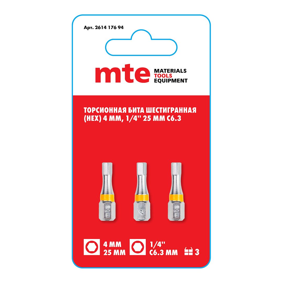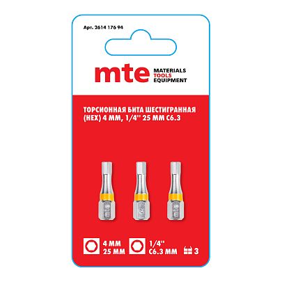 Бита шестигранная HEX 4 мм 25 мм хвостовик С6,3 мм торсионная mte