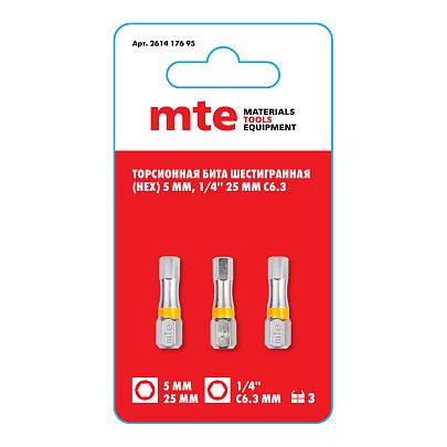Бита с профилем HEXAGON (шестигранник) HEX 5 мм, длина 25 мм, хвостовик С6,3 мм, торсионная, MTE