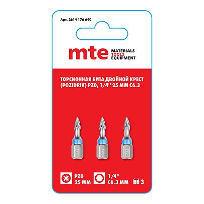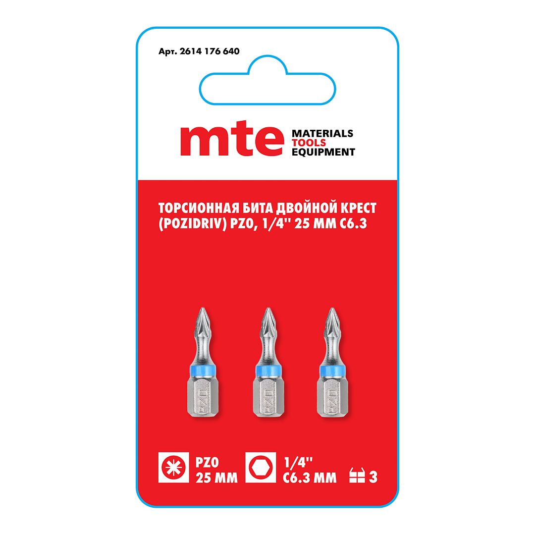 Бита с профилем Pozidriv (двойной крест) PZ0, длина 25 мм, хвостовик С6,3 мм, торсионная, MTE