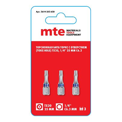 Бита с профилем TORX Hole (торкс - шестилучевая звезда c отверстием) TX20, длина 25 мм, хвостовик С6,3 мм, торсионная, MTE