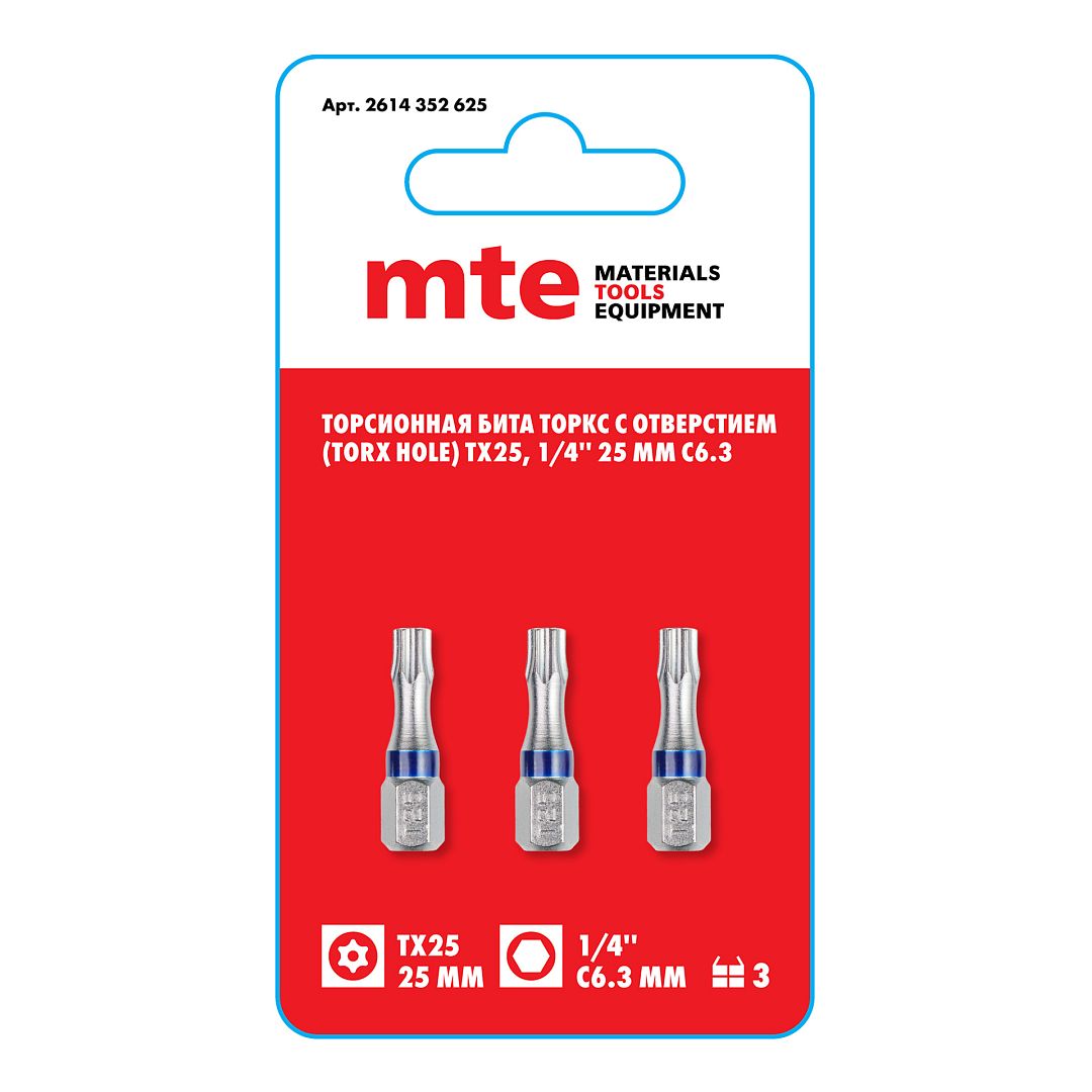 Бита с профилем TORX Hole (торкс - шестилучевая звезда c отверстием) TX25, длина 25 мм, хвостовик С6,3 мм, торсионная, MTE