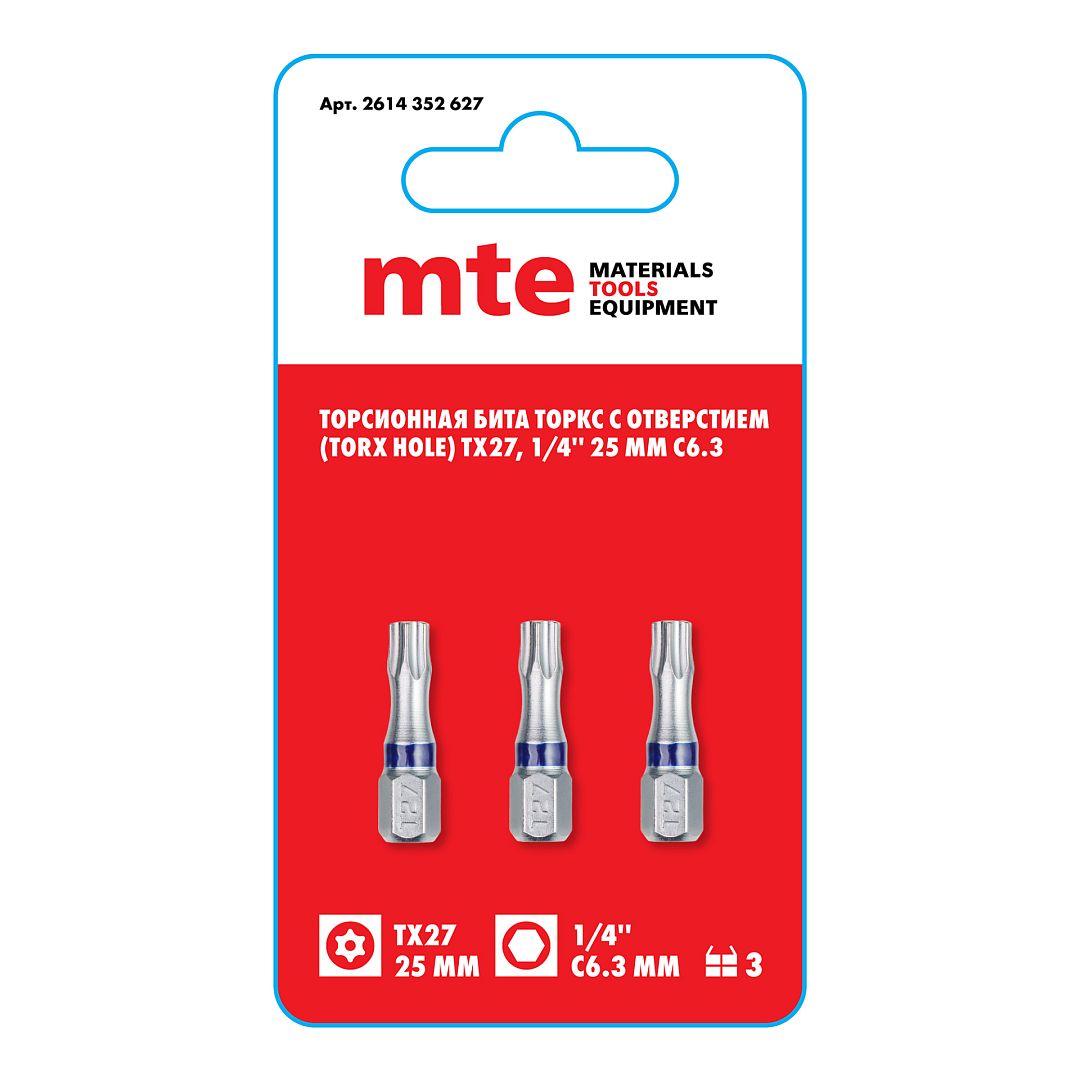 Бита с профилем TORX Hole (торкс - шестилучевая звезда c отверстием) TX27, длина 25 мм, хвостовик С6,3 мм, торсионная, MTE