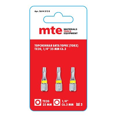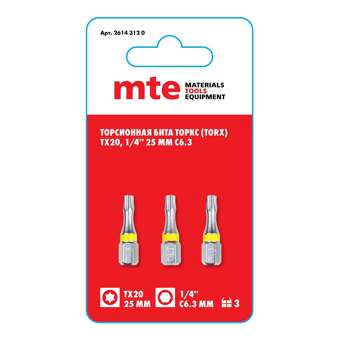 Бита с профилем TORX (торкс - шестилучевая звезда) TX20, длина 25 мм, хвостовик С6,3 мм, торсионная, MTE