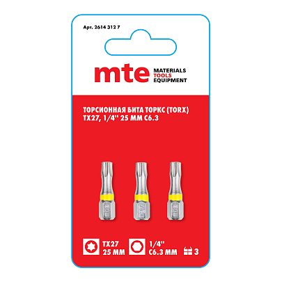 Бита с профилем TORX (торкс - шестилучевая звезда) TX27, длина 25 мм, хвостовик С6,3 мм, торсионная, MTE