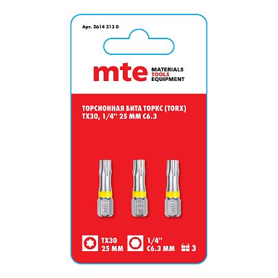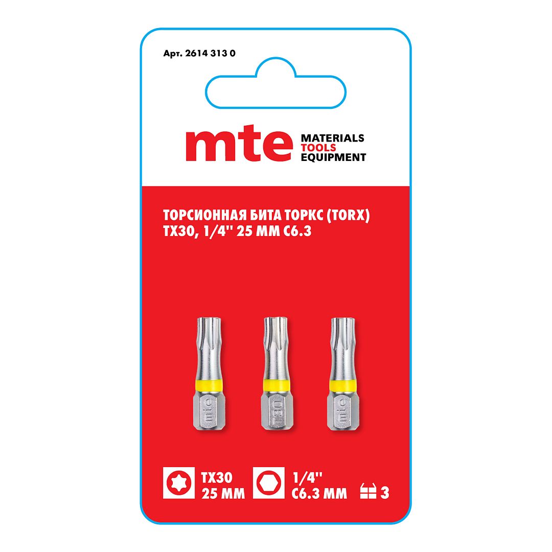 Бита с профилем TORX (торкс - шестилучевая звезда) TX30, длина 25 мм, хвостовик С6,3 мм, торсионная, MTE