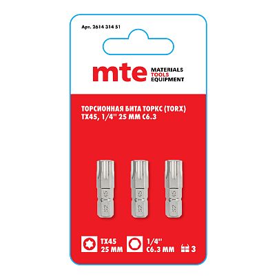 Бита Торкс T45 25 мм хвостовик С6,3 мм торсионная mte