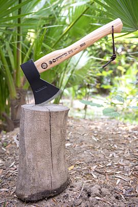 Топор с отверстием в деревянной рукоятке и прочным кожаным шнурком для крепления на запястье, имеет эргономичную рукоятку из выдержанного сухого ясеня, длиной 380 мм, которая покрыта лаком и не скользит в руке.