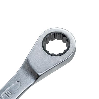 - Накидная часть с двенадцатигранным приводом и трещоточнымм механизмом, позволяет удобно работать в ограниченном пространстве и в стесненных условиях, обеспечивая малый поворот ключа