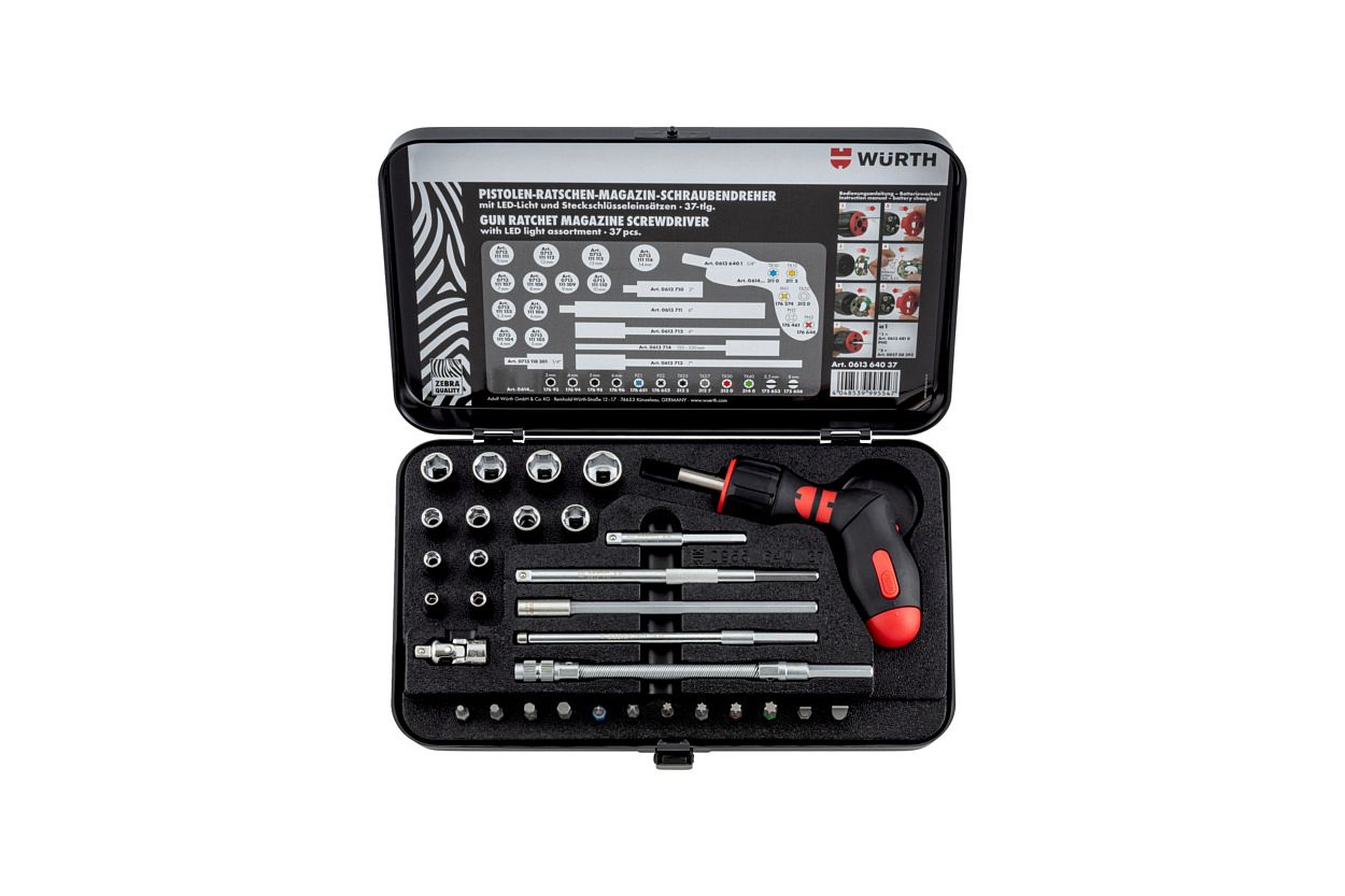 Набор бит и торцевых головок 1/4" с реверсивной отверткой, 37 предметов, Wurth