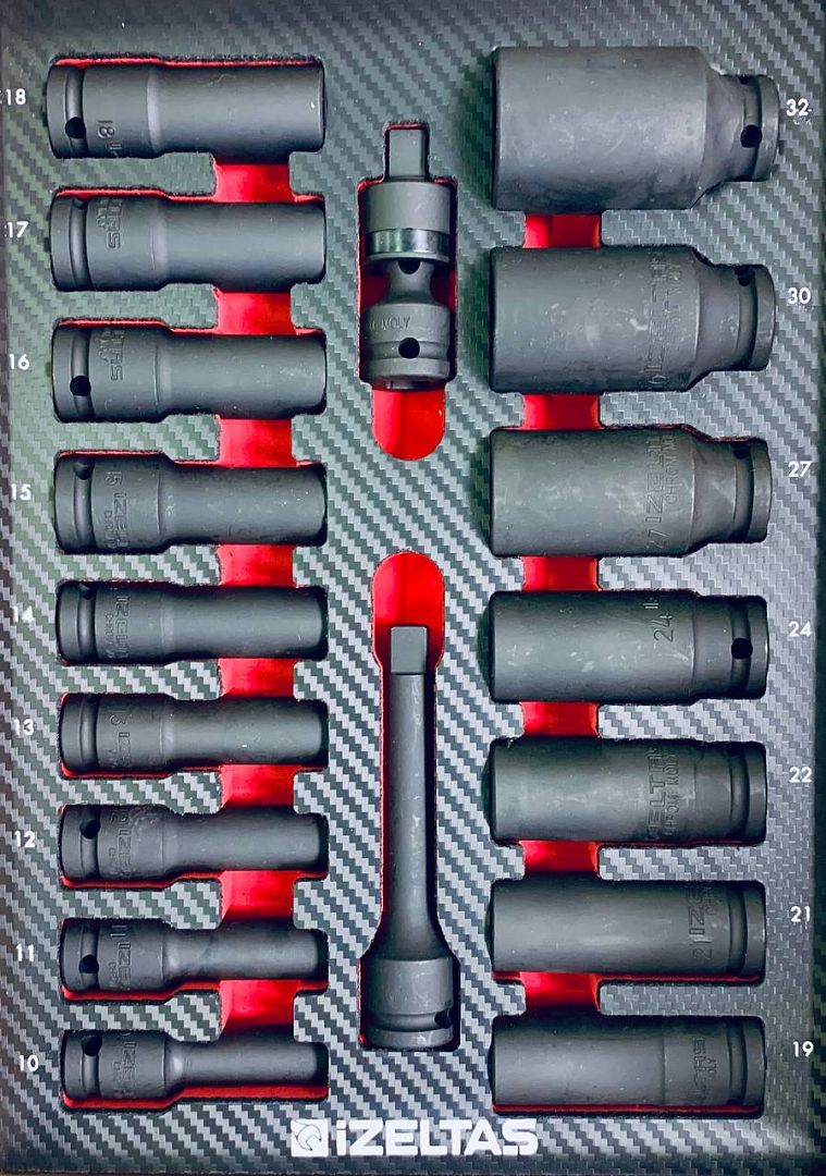 Набор усиленных удлиненных головок 1/2" в ложементе карбон 250x350х30мм 18 предметов IZELTAS