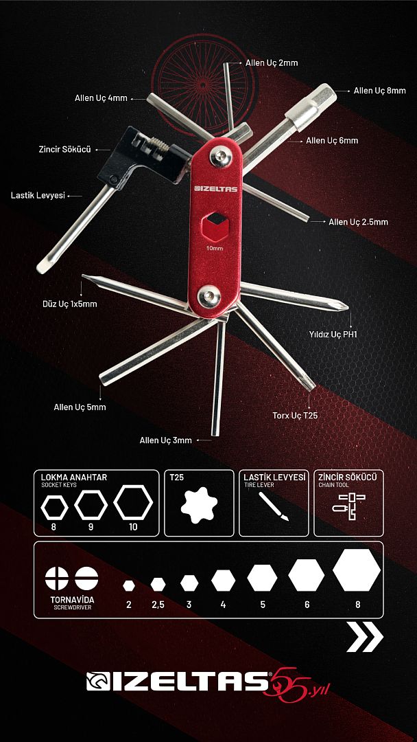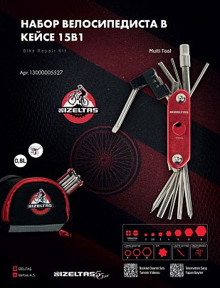 Это многофункциональный набор для ремонта велосипедов, в котором собрано множество инструментов.