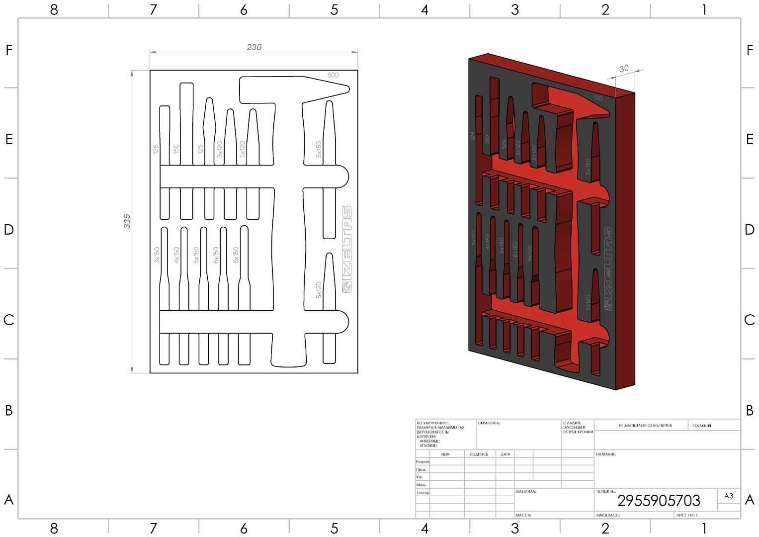 Пустой ложемент EVA, красно черный, для набора ударного инструмента 13 предметов, габариты 230х335, IZELTAS, 2955905703