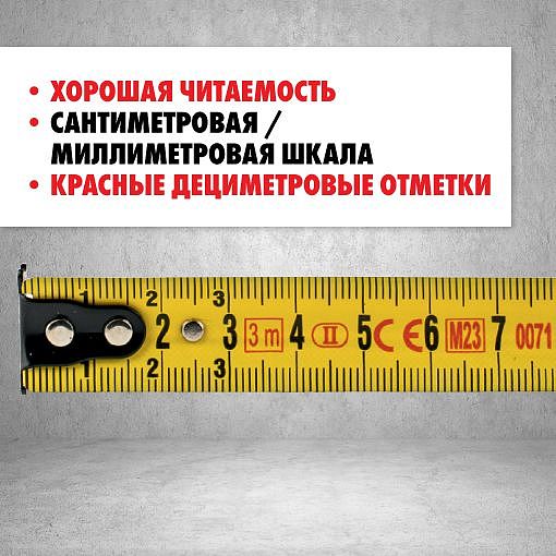 Маркировка значений с отличной читаемостью: лента жёлтого цвета с контрастной шкалой, дециметровые метки дополнительно выделены красным