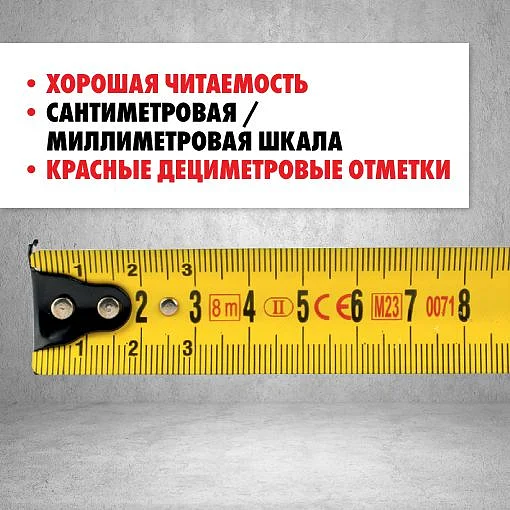 Маркировка значений с отличной читаемостью: лента жёлтого цвета с контрастной шкалой, дециметровые метки дополнительно выделены красным