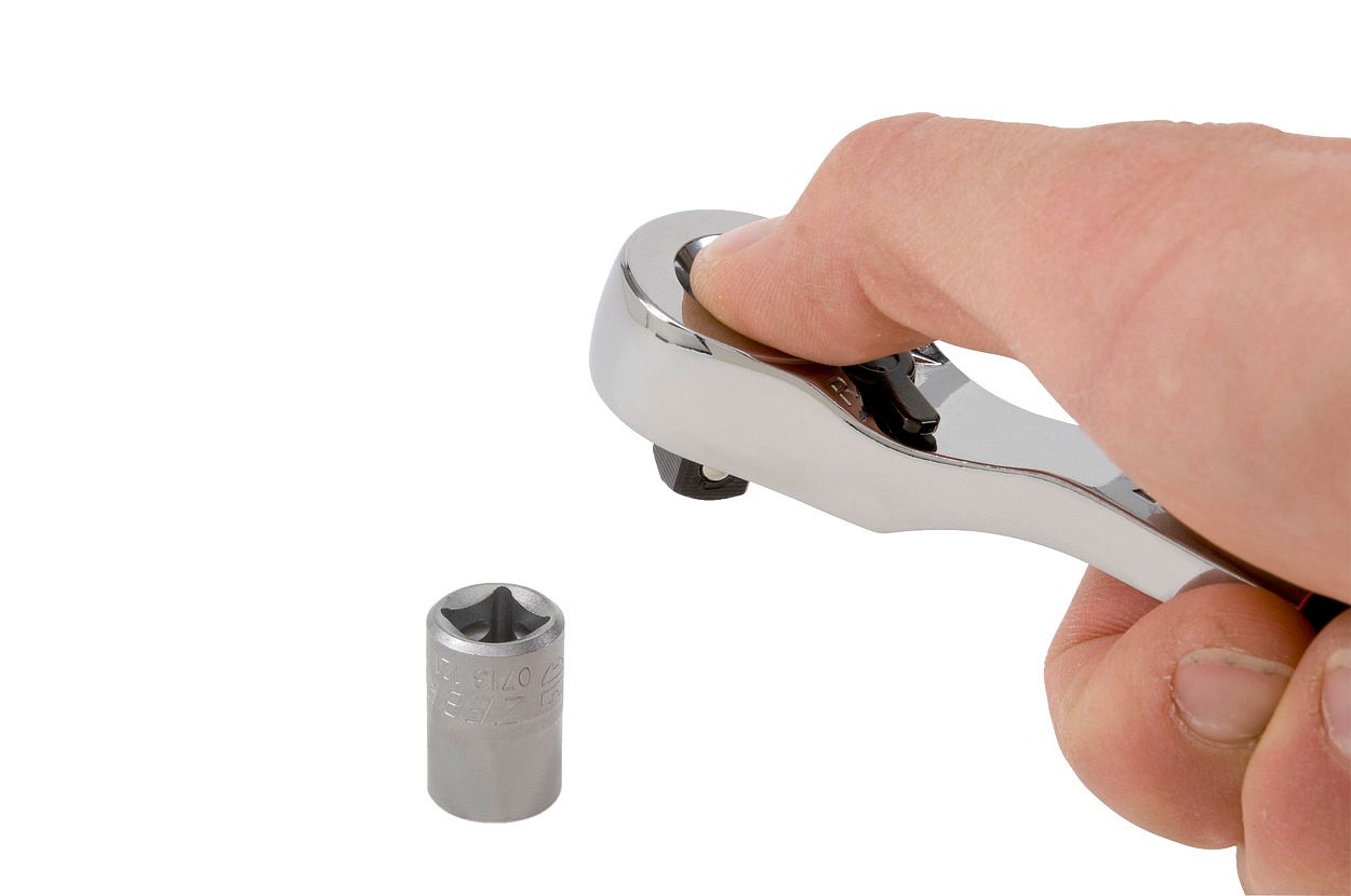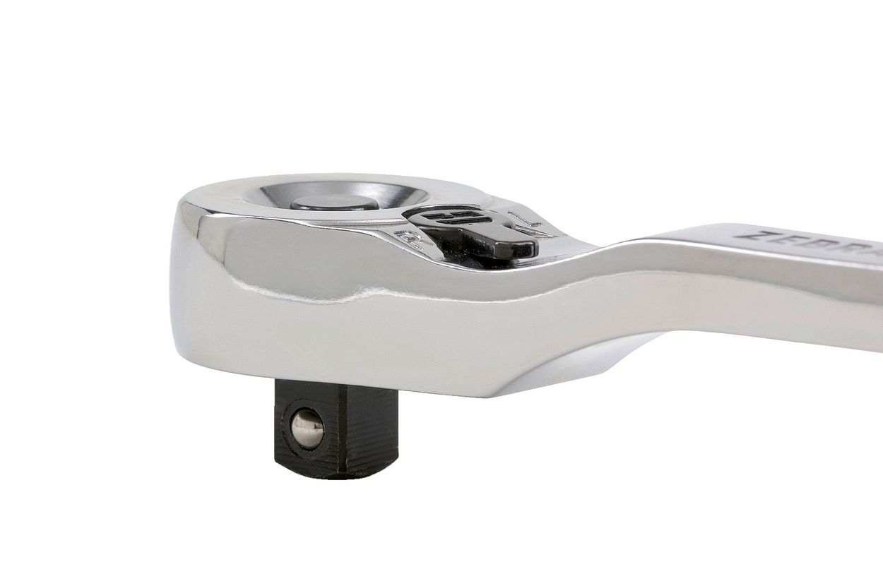 - Утопленный и прочный рычаг реверса, а также выгнутый корпус трещотки обеспечивают более удобное управление