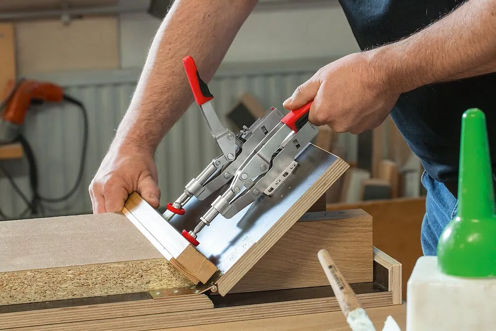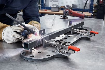 Зажим с коленчатым рычагом, 2.5 кН, с выдвигаемым упором на горизонтальном основании, Bessey