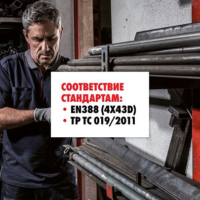 - Соответствие стандартам: EN388 (4X43D), ТР ТС 019/2011