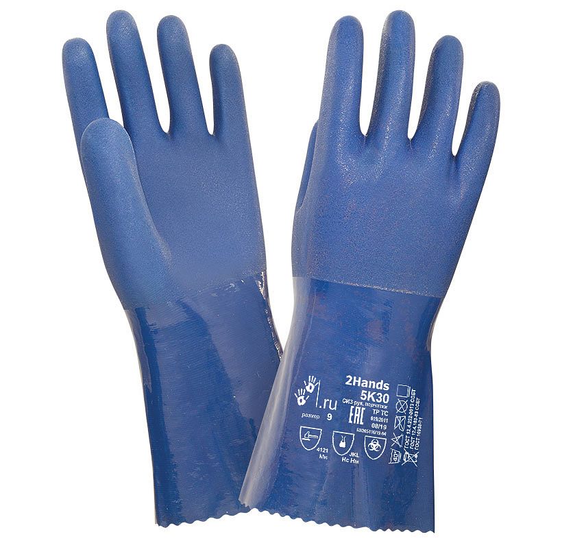 Перчатки защитные химостойкие - трикотажная основа interlock (интерлок) с полным покрытием ПВХ, тройной облив, анатомическая форма, длина 300 мм.