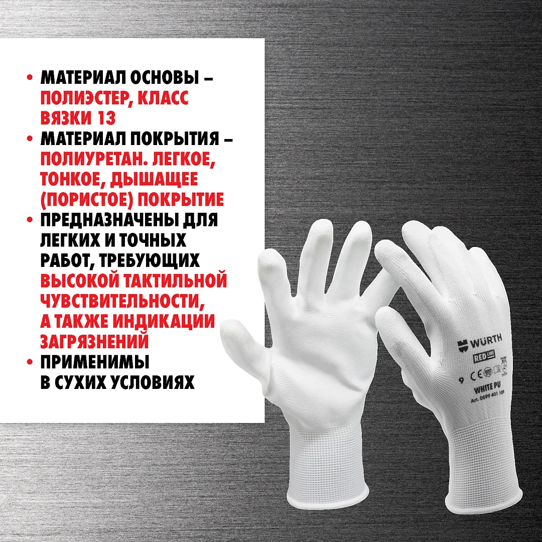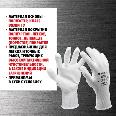 Тонкое "дышащее" полиуретановое покрытие ладони обеспечивает хороший захват деталей и инструментов. Покрытие не содержит силикон и не оставляет следов на глянцевых и стеклянных поверхностях.