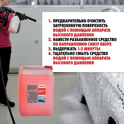 Средство используется в разбавленном виде. Для пенокомплектов разбавление водой в соотношении 1:2-1:3, для метода распыления – 1:20-1:30, для дозатрона – 2-6%. Концентрация зависит от сезона, степени загрязнения и состава воды, используемой для разбавления. Предварительно очистить загрязненную поверхность водой с помощью аппарата высокого давления. Нанести разбавленное средство по направлению снизу вверх. Выдержать 1-2 минуты. Тщательно смыть средство водой с помощью аппарата высокого давления.