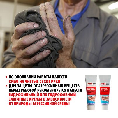 По окончании работы нанести крем на чистые сухие руки. Для защиты от агрессивных веществ перед работой рекомендуется нанести гидрофильный (арт. 2890 600 100) или гидрофобный (арт. 2890 600 200) защитные кремы в зависимости от природы агрессивной среды.