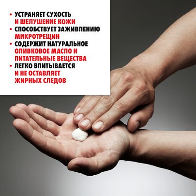 Восстанавливает кожу после длительного ношения резиновых перчаток из полимерных материалов.
